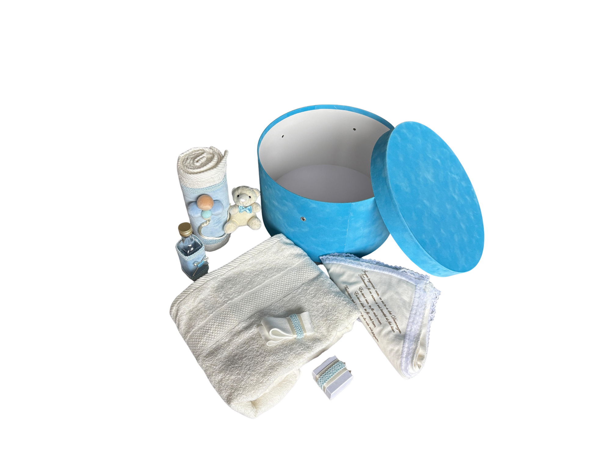 Un trusou complet de botez pentru baietei, realizat cu grija si rafinament, in nuanta delicata de albastru, simbol al puritatii si protectiei. Fiecare piesa a fost aleasa pentru a aduce frumusete si semnificatie in ziua cea mare, iar intregul set este ambalat intr-o cutie eleganta din catifea, perfecta pentru a transforma trusoul intr-un cadou de suflet si o amintire pretioasa.