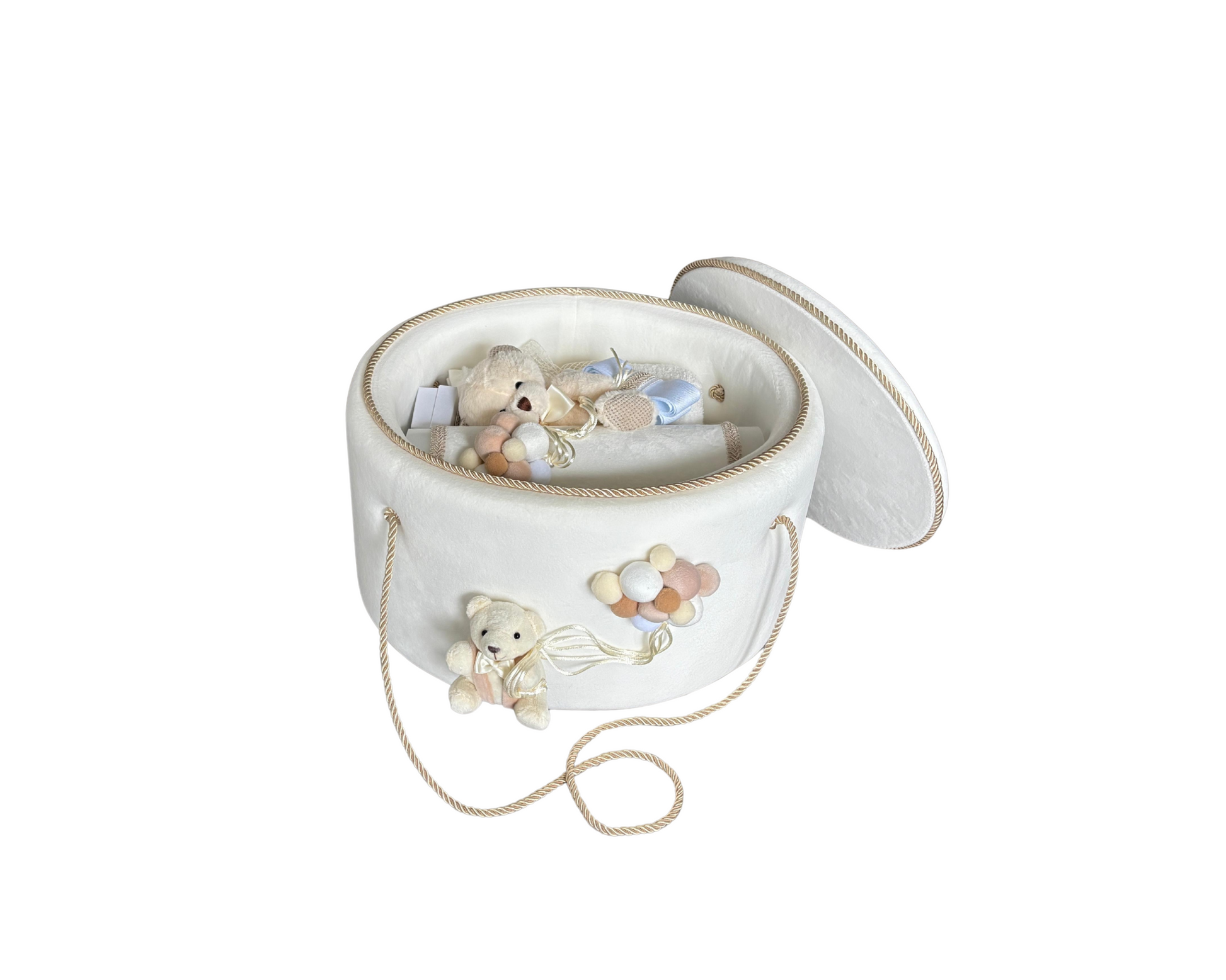 Un trusou complet de botez pentru baietei sau fetite, realizat cu eleganta si atentie la detalii, in nuantele atemporale de alb si crem, simboluri ale puritatii, luminii si inocentei. Setul este prezentat intr-un cufar buretat din catifea fina, care nu doar infrumuseteaza ansamblul, ci se transforma ulterior intr-o cutie de amintiri pretioase pentru familie.